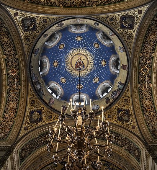 Davanti all'iconostasi risalta il grande candelabro d'argento donato dal granduca russo Paolo Petrovich Romanov durante la sua visita a Trieste nel 1772.
