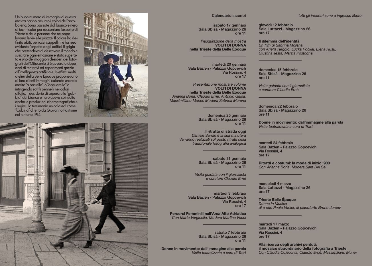 La mostra (17 gennaio- 15 marzo) è accompagnata da un ricco calendario di incontri a ingresso libero, che si svolgeranno tra la Sala Sbisà del Magazzino 26, la Sala Bazlen di Palazzo Gopcevich e la Sala Luttazzi. Sono previsti la presentazione del catalogo della mostra a cura di Claudio Erné con un contributo di Arianna Boria e l’impaginazione grafica di Cristina Vendramin, visite guidate, ritratti realizzati dal vivo con la minutera di Daniele Sandri, approfondimenti sulla moda e sui percorsi femminili nell’area alto-adriatica, visite teatralizzate sulle protagoniste femminili dell’epoca, una proiezione cinematografica “Il dilemma dell’identità” di Sabrina Morena e un appuntamento musicale con Paolo Venier.